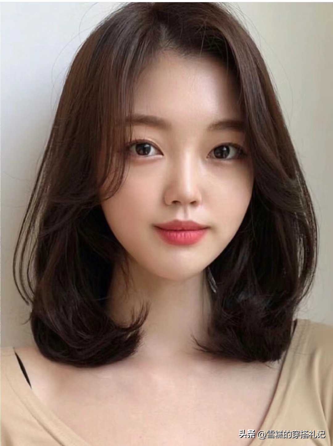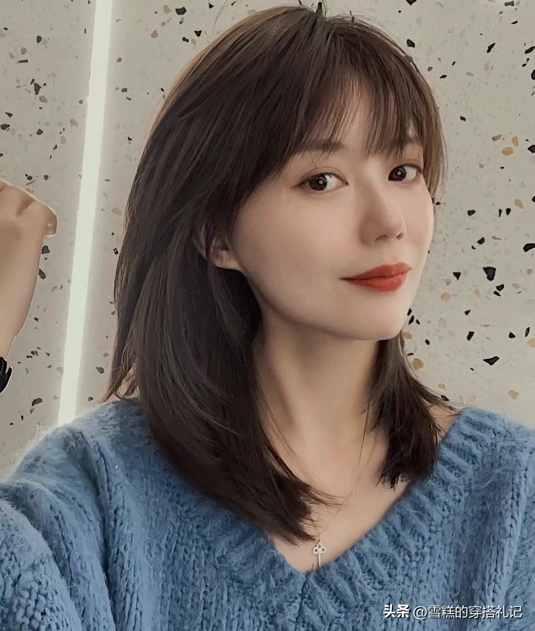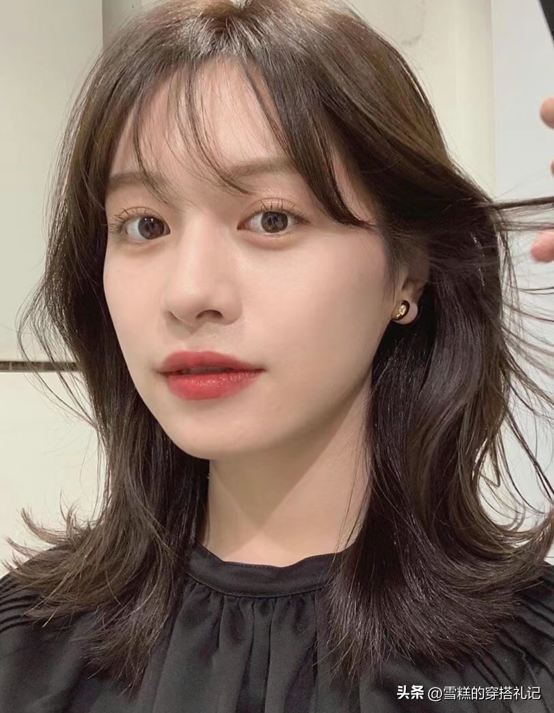 如果是顺直的锁骨发,那么本身线条就已经足够流畅,不需要再过分的凹出线条,否则会给人一种过分呆板、刻意的感觉,可以搭配上一款轻薄的刘海儿,微微的增加一些弧度,使得整体发型更加有透气性,看着更加的清新减龄。