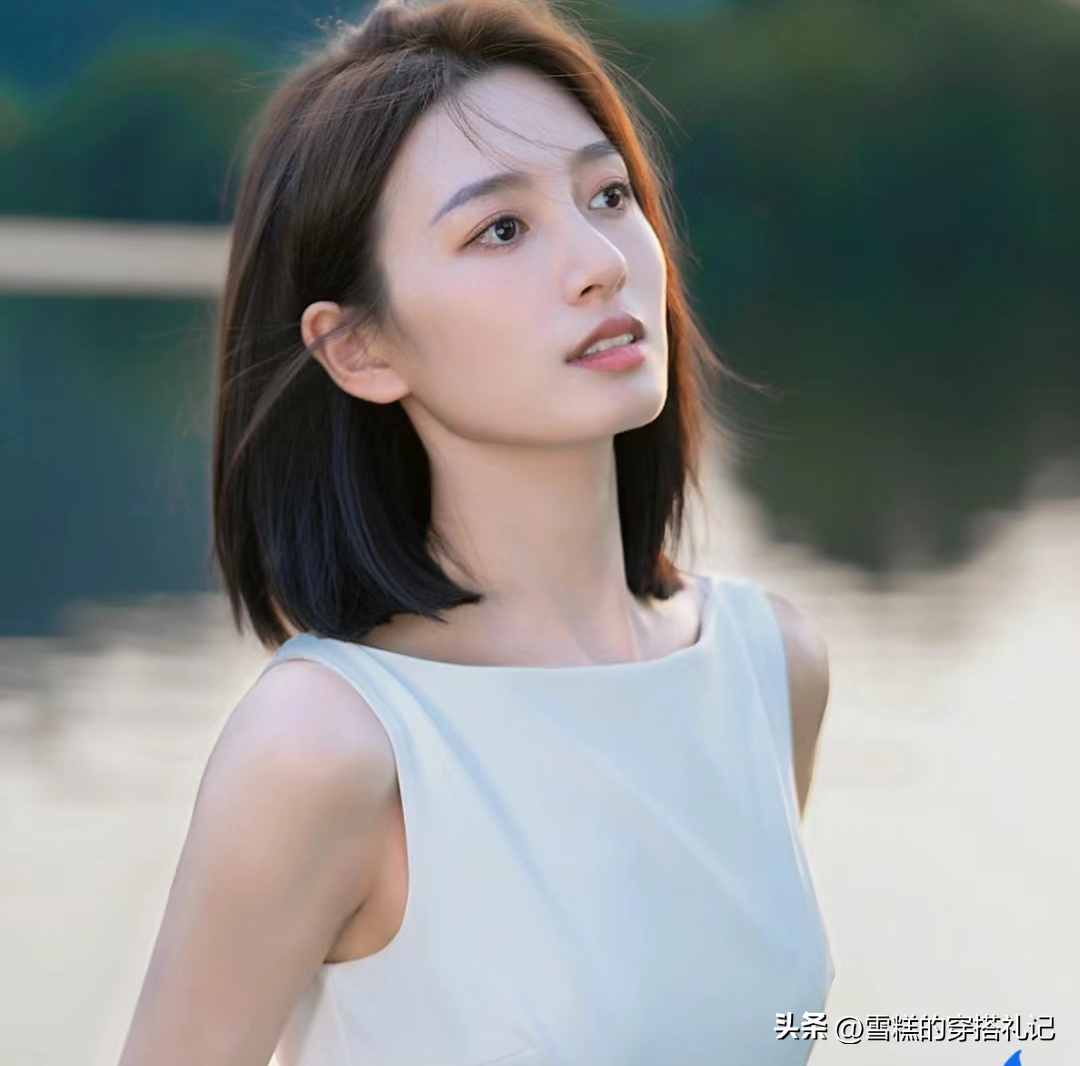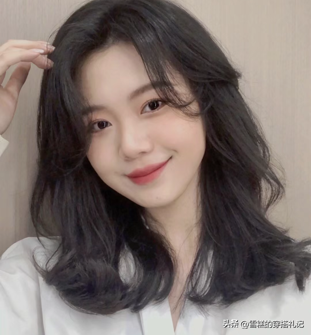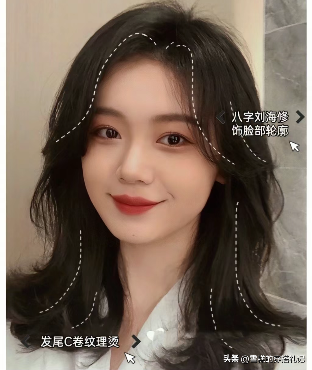 如果是顺直的锁骨发,那么本身线条就已经足够流畅,不需要再过分的凹出线条,否则会给人一种过分呆板、刻意的感觉,可以搭配上一款轻薄的刘海儿,微微的增加一些弧度,使得整体发型更加有透气性,看着更加的清新减龄。